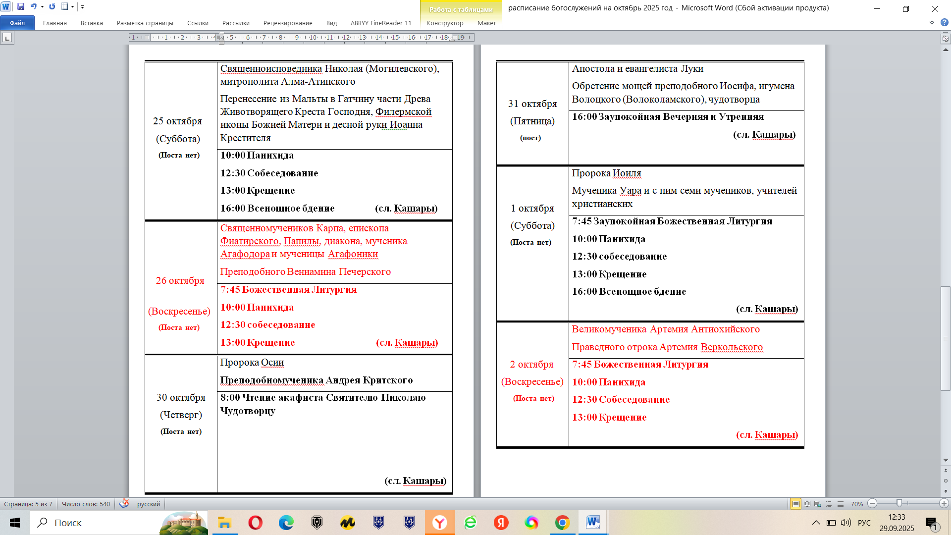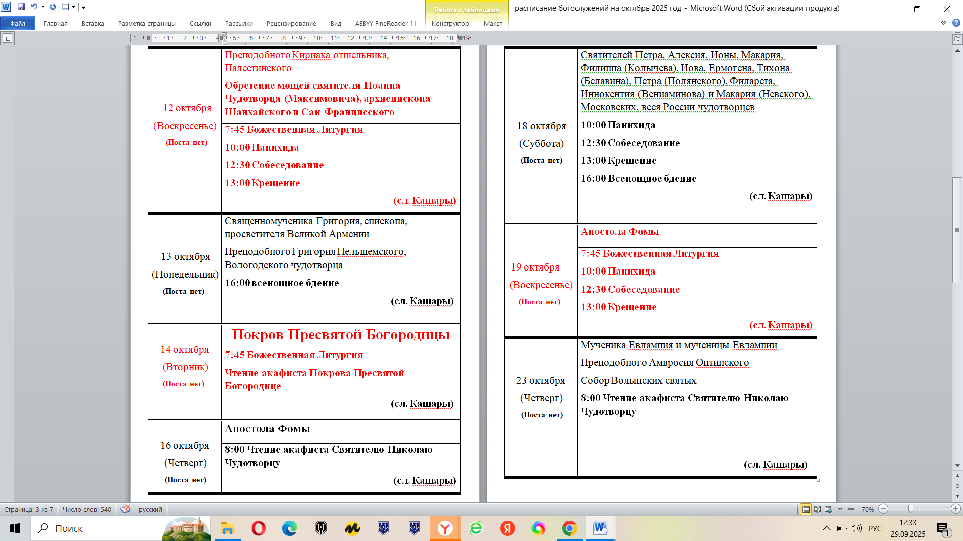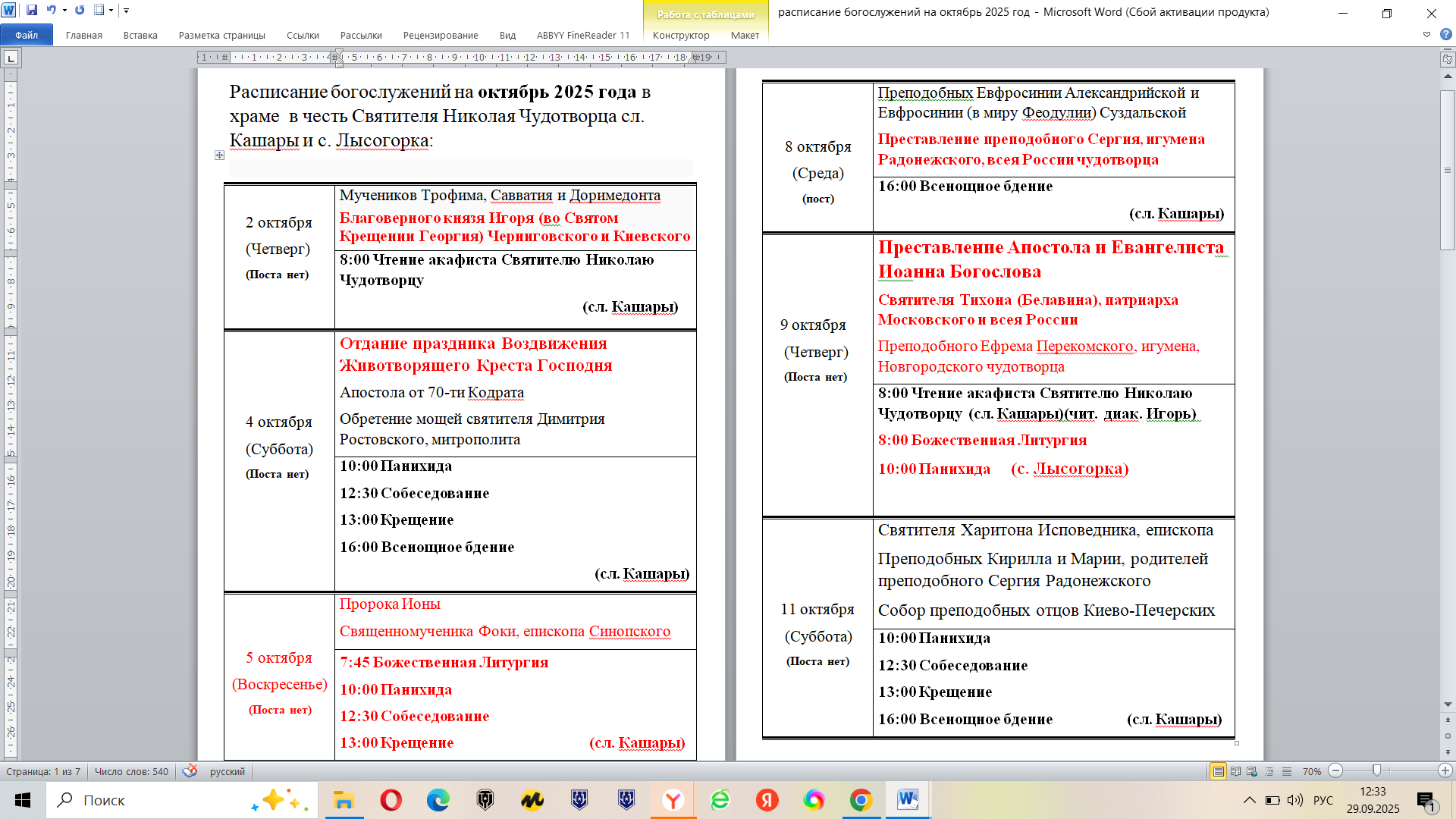 Расписание богослужений на октябрь 2025 года в храме в честь Святителя Николая Чудотворца сл. Кашары и с. Лысогорка: